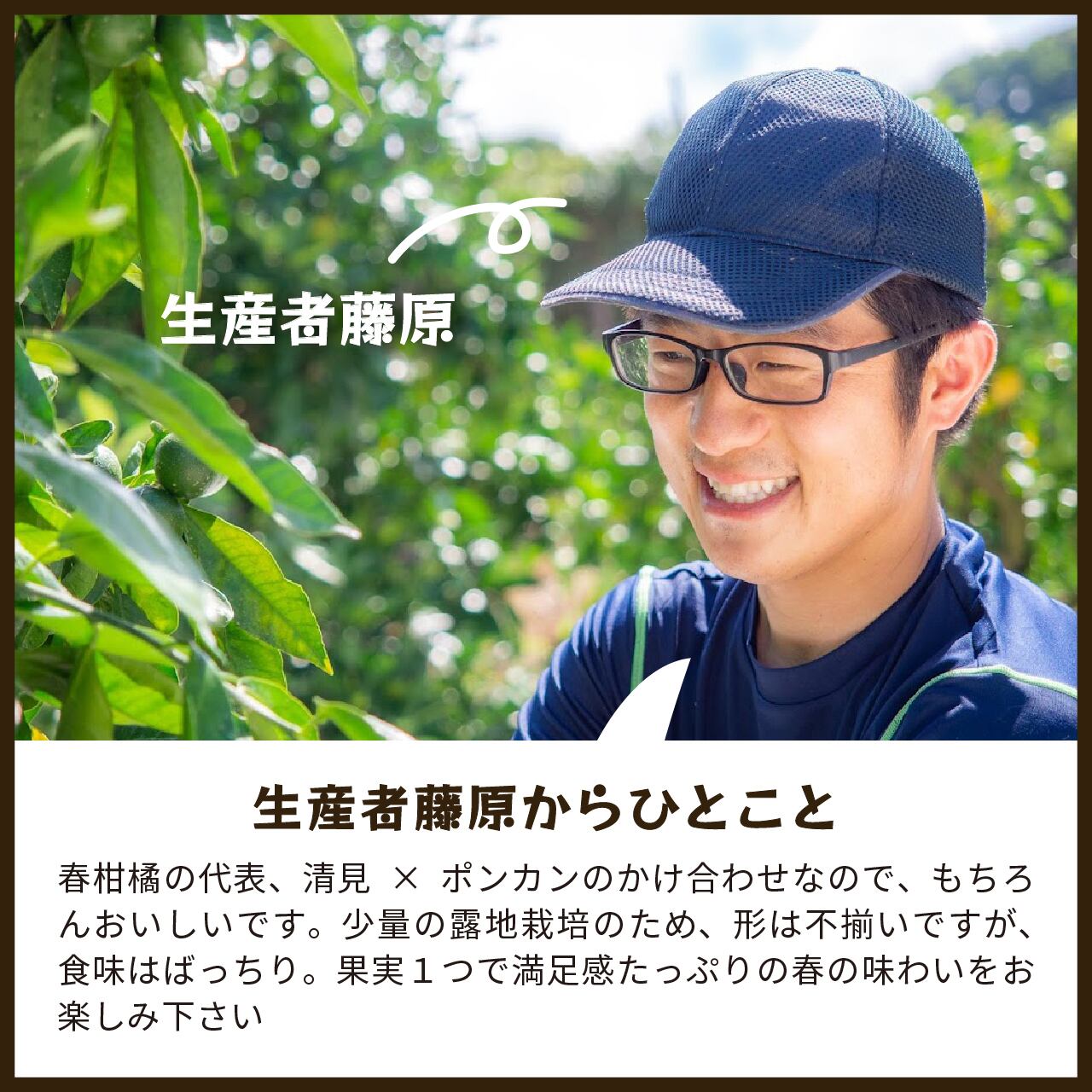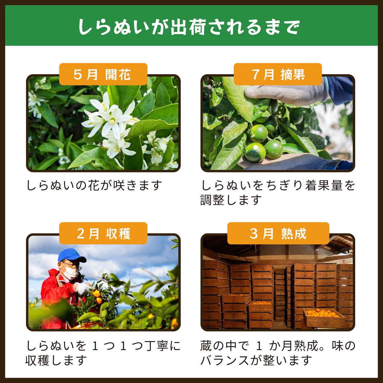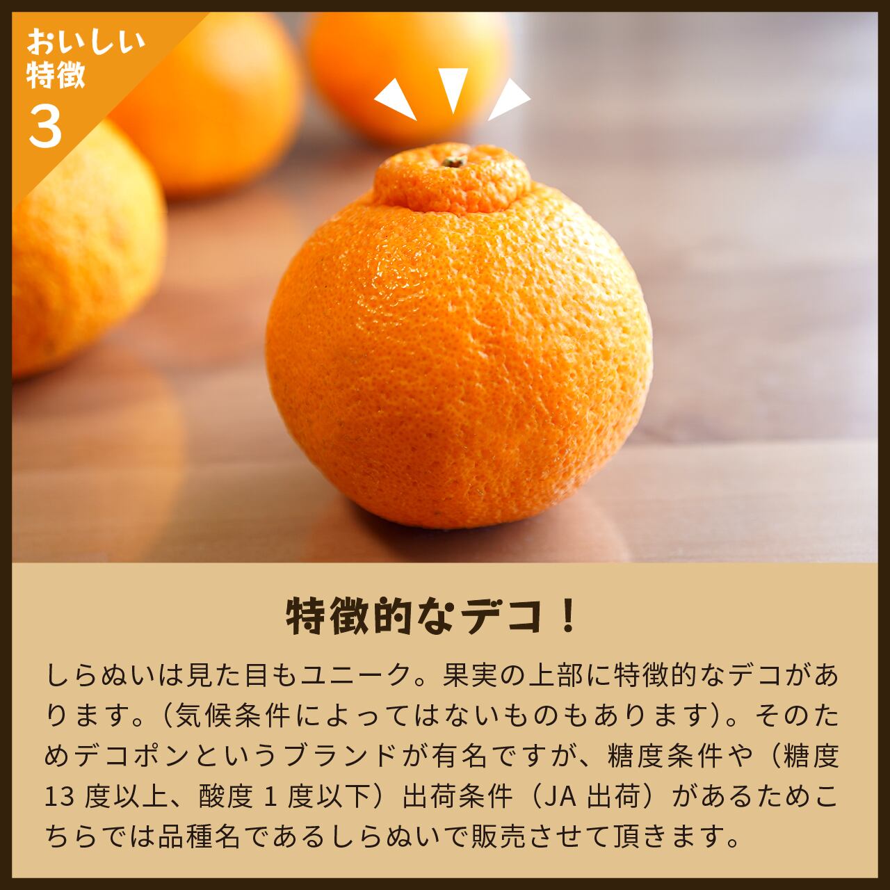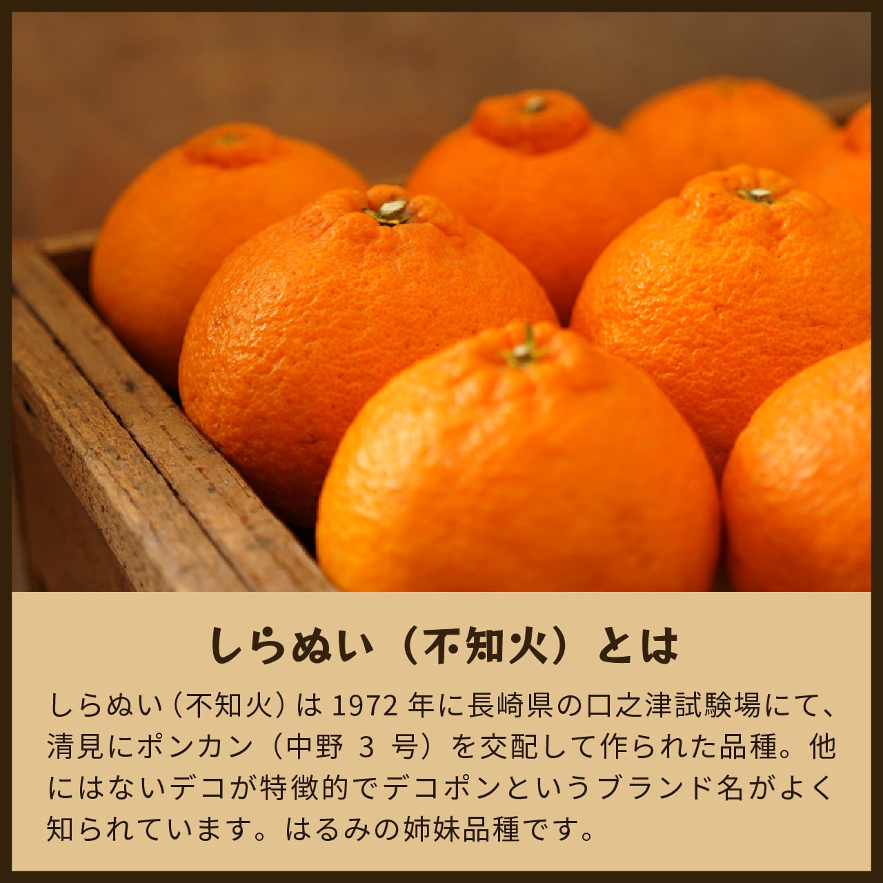 しらぬい(不知火)は1972年に長崎県の口之津試験場にて、清見にポンカン(中野3号)を交配して作られた品種。他にはないデコが特徴的でデコポンというブランド名がよく知られています。持っちり食感が特徴のはるみの姉妹品種です。