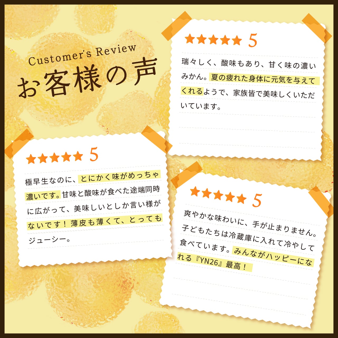 YN26は極早生みかんの優良品種、「ゆら早生」を品種改良して作られた和歌山生まれの品種。ゆら早生の食味を受け継ぎながら、ゆら早生より早い9月に旬を迎えます。この品種ならではの爽やかな味わい、シャクっとした食感を秋の味覚としてお楽しみくださいませ♪